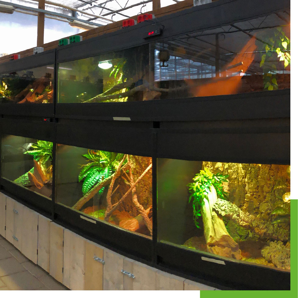Wij zijn als bedrijf voorstander van ruime en natuurgetrouwe huisvesting en u vindt daarom ook een ruim assortiment aan terraria en paludaria op voorraad. Ook bouwen we veel op maat en in veel verschillende materialen.